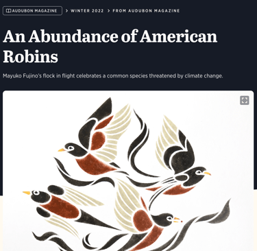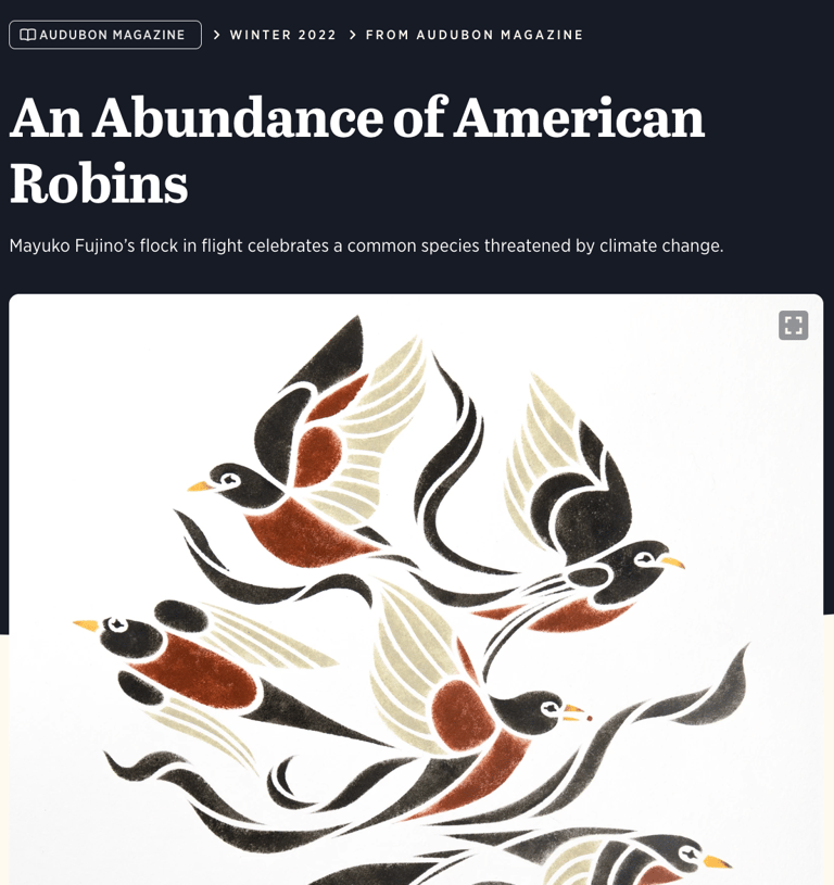 I was featured in The Aviary, an Audubon magazine series published by the National Audubon Society. The series showcases artists who explore the intersection of birds and art as a catalyst for shifting perspectives and perceptions.